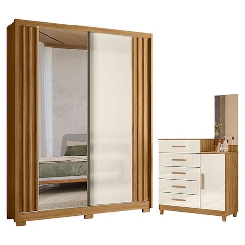 Começou a montar seu quarto? Apresentamos para você este belo conjunto composto pelo guarda roupa da linha Colorado e a cômoda da linha Lisboa. O guarda roupa conta com duas portas deslizantes, sendo uma com espelho. O diferencial é o seu acabamento ripado em MDF. Internamente, oferece três gavetas com corrediças telescópicas. A cômoda complementa o conjunto, possuindo uma porta e cinco gavetas com corrediças metálicas. O painel com espelho garante mais praticidade para o seu dia a dia. Assim como o guarda roupa, a cômoda acompanha pés em PVC garantindo uma sustentação segura. Fabricados pela Moval, são desenvolvidos em MDP, ideal para quem está buscando beleza, qualidade e organização para compor seu quarto. Aproveite e garanta já o seu!