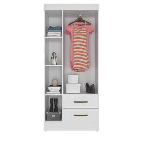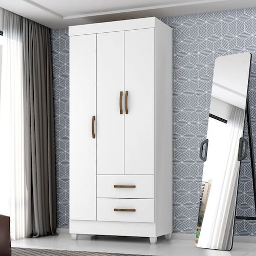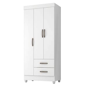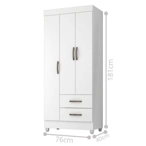 Feito em MDP. Contém 3 portas, 1 cabideiro em alumínio, 2 gavetas com amplo espeço interno e com corrediças metálicas para uma melhor abertura e delizamento.