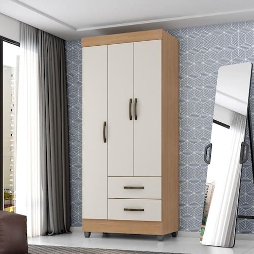 Feito em MDP. Contém 3 portas, 1 cabideiro em alumínio, 2 gavetas com amplo espeço interno e com corrediças metálicas para uma melhor abertura e delizamento.