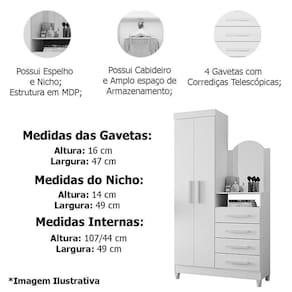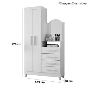 - Não nos responsabilizamos pela montagem dos produtos. Todos os produtos acompanham acessórios para que sejam montados. - Não nos responsabilizamos, no ato da , por subir escadas/elevadores ou por guincho em apartamentos. - Eventuais despesas são de responsabilidade do comprador; - Confira as dimensões deste produto e certifique-se de que passará normalmente por supostos elevadores, portas, escadas e/ou corredores de sua residência; - Não aceitamos de produtos com caixas violadas ou materiais danificados, confira a quantidade de volumes e se o que está sendo entregue corresponde com a mercadoria adquirida, não aceitamos após o prazo de arrependimento de 7 dias corridos. Características Gerais do Produto: - Altura: 179 cm - Gavetas: 4 Gavetas com Corrediças Telescópicas - Ideal para: Quarto - Informações Adicionais: Possui espelho; Possui Nicho; Não Acompanha Objetos Decorativos; - Largura: 103 cm - Material: MDP - Pintura: Produto com Cores na Cor Branco - Portas: 2 Portas - Profundidade: 38 cm - Tipo de Porta: Porta de Bater - Acabamento: Pintura UV - Informações Adicionais: - Não nos responsabilizamos pela montagem dos produtos. Todos os produtos acompanham acessórios para que sejam montados. - Não nos responsabilizamos, no ato da , por subir escadas/elevadores ou por guincho em apartamentos. - Eventuais despesas são de responsabilidade do comprador; - Confira as dimensões deste produto e certifique-se de que passará normalmente por supostos elevadores, portas, escadas e/ou corredores de sua residência; - Não aceitamos de produtos com caixas violadas ou materiais danificados, confira a quantidade de volumes e se o que está sendo entregue corresponde com a mercadoria adquirida, não aceitamos após o prazo de arrependimento de 7 dias corridos.