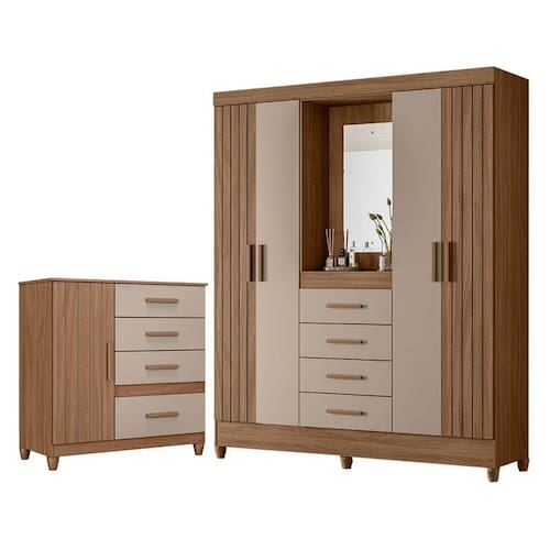 Organize seu quarto com elegância e o melhor custo benefício do mercado. Apresentamos o Guarda Roupa Solteiro Atenas e Cômoda Vênus fabricados pela Moval. Guarda Roupa possui quatro portas, quatro gavetas equipadas com corrediças metálicas, modelo com capelinha central com espelho, destacando o visual refinado e moderno, puxadores em MDF, cabideiros em alumínio para melhor organização interna e pés em PVC. A cômoda possui 04 gavetas com corrediças metálicas, 01 porta com detalhes frisados, pés em PVC e puxadores em MDF. Fabricado com materiais de alta qualidade que garante resistência e durabilidade ao produto. Confira mais detalhes e aproveite!
