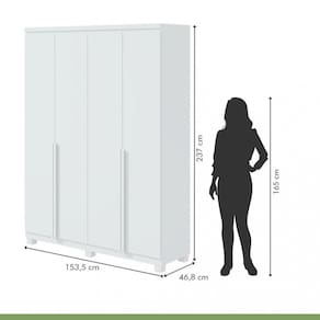 Características: 4 Portas Material do Puxador da Porta - MDF Tipo de Dobradiça - Metálica Tipo de Puxador da Porta - Externo 02 Gavetas Tipo de Gaveta - Interna Peso Máximo por Gaveta - 5 kg Tipo de Puxador da Gaveta - Embutido Tipo de Corrediça da Gaveta - Metálica Telescópica 5 Prateleiras Peso Máximo por Prateleira - 12 kg 1 Calceiro 1 Cabideiro 6 Pés Material Principal - MDF Escala de Brilho - Fosco Sistema de Montagem - Parafusos E Minifix