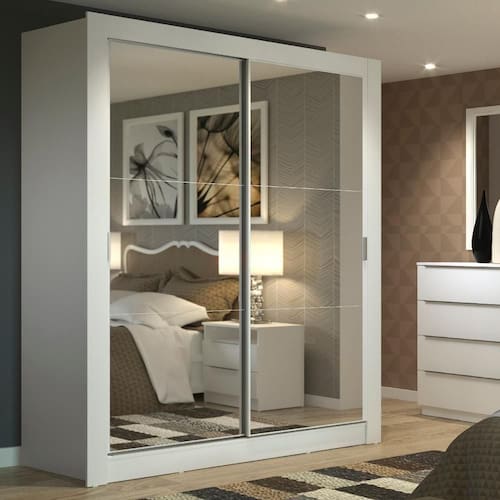 Guarda-Roupa com duas portas de correr de deslizamento suave, trilhos em alumínio, dobradiças metálicas e ferragens de qualidade que proporcionam melhor sustentação ao móvel. Contempla duas gavetas com corrediças metálicas, duas prateleiras e três nichos, além de um cabideiro de metal resistente e de tamanho diferenciado, 105 cm.