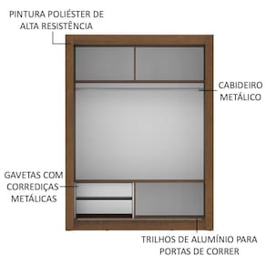 - Contempla duas gavetas com corrediças metálicas, duas prateleiras e três nichos, além de um cabideiro de metal resistente e de tamanho diferenciado.