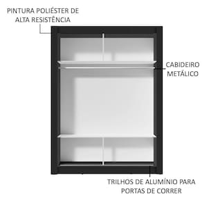 O acabamento da estrutura externa é preto. A parte interna é branca e as portas são no padrão amadeirado Rustic. O processo é feito com a Pintura Poliéster de 7 camadas exclusiva da Madesa. Este método não agride o meio ambiente e protege o móvel por muito mais tempo.