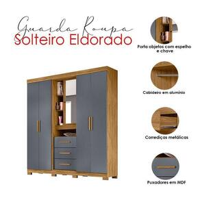 Organize seu quarto com elegância e o melhor custo benefício do mercado. Apresentamos o Guarda Roupa Solteiro Eldorado e Cômoda Dhara fabricados pela Moval. Guarda Roupa com 05 portas e 03 gavetas com corrediças metálicas, portas laterais avançadas, porta objetos com espelho e chave, puxadores em MDF, cabideiros e calceiros em alumínio para melhor organização interna e pés em PVC. A cômoda possui 04 gavetas com corrediças telescópicas, moldura lateral de 25mm e tampo de 15mm, puxadores na cor bronze e pés em PVC. Fabricado com materiais de alta qualidade que garante resistência e durabilidade ao produto. Confira mais detalhes e aproveite! Características Técnicas: