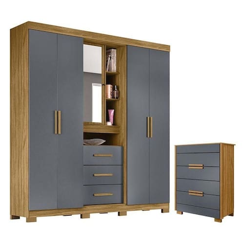 Organize seu quarto com elegância e o melhor custo benefício do mercado. Apresentamos o Guarda Roupa Solteiro Eldorado e Cômoda Dhara fabricados pela Moval. Guarda Roupa com 05 portas e 03 gavetas com corrediças metálicas, portas laterais avançadas, porta objetos com espelho e chave, puxadores em MDF, cabideiros e calceiros em alumínio para melhor organização interna e pés em PVC. A cômoda possui 04 gavetas com corrediças telescópicas, moldura lateral de 25mm e tampo de 15mm, puxadores na cor bronze e pés em PVC. Fabricado com materiais de alta qualidade que garante resistência e durabilidade ao produto. Confira mais detalhes e aproveite! Características Técnicas: