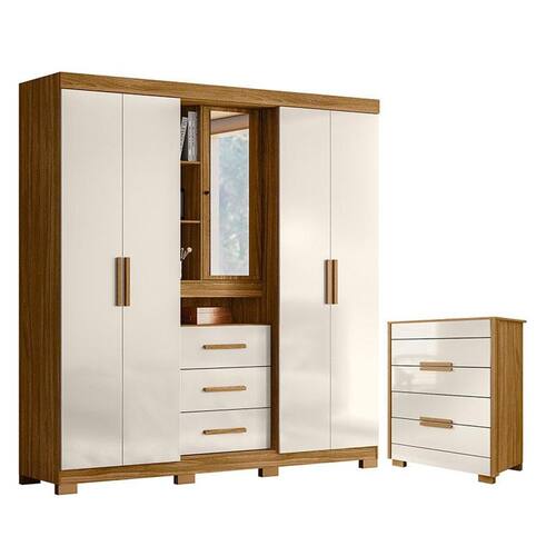 Organize seu quarto com elegância e o melhor custo benefício do mercado. Apresentamos o Guarda Roupa Solteiro Eldorado e Cômoda Dhara fabricados pela Moval. Guarda Roupa com 05 portas e 03 gavetas com corrediças metálicas, portas laterais avançadas, porta objetos com espelho e chave, puxadores em MDF, cabideiros e calceiros em alumínio para melhor organização interna e pés em PVC. A cômoda possui 04 gavetas com corrediças telescópicas, moldura lateral de 25mm e tampo de 15mm, puxadores na cor bronze e pés em PVC. Fabricado com materiais de alta qualidade que garante resistência e durabilidade ao produto. Confira mais detalhes e aproveite! Características Técnicas: