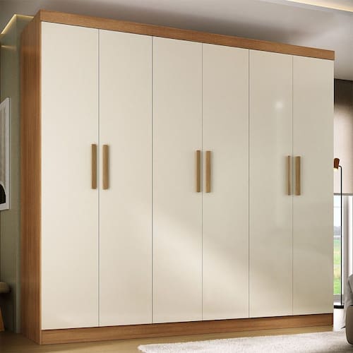 O(a) Guarda-Roupa Solteiro Lancaster 6 Portas 3 Gavetas 100% Mdf Cinamomo/Off White - Loja é produzido em 100% MDF na escala de brilho Fosco, e possui um grau de dificuldade de montagem: Médio.