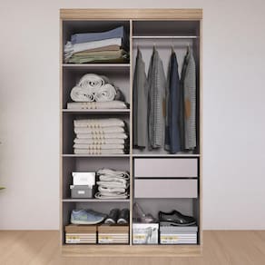 4 portas de dobradiças 5 prateleiras 2 gavetas com Corrediças Metálicas Puxadores em MDF Fabricado em MDP Acabamento Touch Alto-Relevo ou Alto Brilho UV (nas cores Branco e Off-white) e Semibrilho parte interna Pés inclusos 2 cabideiros de madeira Fácil montagem