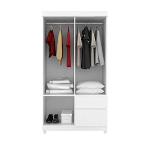 O Guarda-Roupa Lótus é compacto e agrega funcionalidade em seu interior. Dois compartimentos com cabideiros, duas gavetas com corrediças metálicas, sendo uma de maior profundidade. Confeccionado em MDP de alto padrão, acabamento com pintura UV e pés de série, tudo para o melhor desempenho do produto.