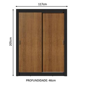 Medidas totais do guarda-roupa: 205 cm de altura x 117 cm de largura x 46 cm de profundidade.