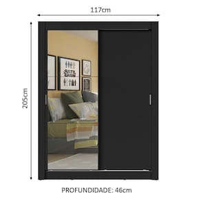 Medidas totais do guarda-roupa: 205 cm de altura x 117 cm de largura x 46 cm de profundidade.