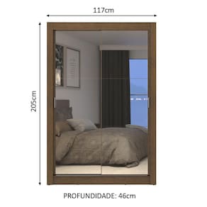 Medidas totais do guarda-roupa: 205 cm de altura x 117 cm de largura x 46 cm de profundidade.