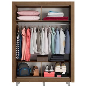 Itens inclusos: - Um (1) cabideiro grande - Duas (2) prateleiras e quatro (4) nichos - Duas (2) portas de correr, sendo uma (1) de madeira e uma (1) com espelhos, ambas com puxadores em PVC - Um (1) Kit com seis (6) pés em PVC