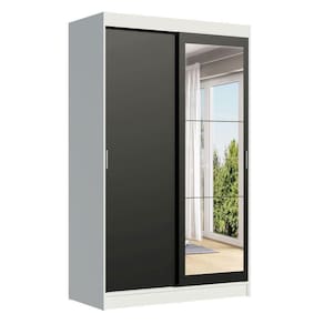 Itens inclusos: - Duas (2) portas de correr em MDP com puxadores em alumínio, sendo uma (1) com espelhos - Duas (2) gavetas com corrediças metálicas - Dois (2) cabideiros de madeira - Cinco (5) nichos