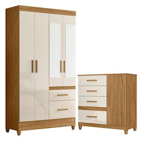 Guarda Roupa Solteiro Madri com espelho e Cômoda Vênus com pés Freijó Off White – Moval