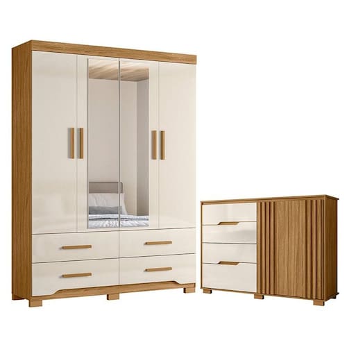 Organize seu quarto com elegância e o melhor custo benefício do mercado. Apresentamos o Guarda Roupa Solteiro Miami e Cômoda Texas fabricados pela Moval. Guarda Roupa com 04 portas e 04 gavetas com corrediças telescópicas, espelhos inclusos, puxadores em MDF, cabideiro em alumínio para melhor organização interna, detalhes usinados na gaveta, espaço ideal para roupas longas e pés em PVC. A cômoda possui 04 gavetas com corrediças telescópicas, dobradiças 35mm com amortecedor, portas com detalhes ripados, puxadores usinados e pés em PVC. Fabricado com materiais de alta qualidade que garante resistência e durabilidade ao produto. Confira mais detalhes e aproveite!