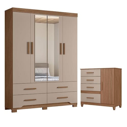 Organize seu quarto com elegância e o melhor custo benefício do mercado. Apresentamos o Guarda Roupa Solteiro Miami e Cômoda Vênus fabricados pela Moval. Guarda Roupa com 04 portas e 04 gavetas com corrediças telescópicas, espelhos inclusos, puxadores em MDF, cabideiro em alumínio para melhor organização interna, detalhes usinados nas gavetas, espaço ideal para roupas longas e pés em PVC. A cômoda possui 04 gavetas com corrediças metálicas, 01 porta, detalhe frisado, pés em PVC e puxadores em MDF. Fabricado com materiais de alta qualidade que garante resistência e durabilidade ao produto. Confira mais detalhes e aproveite!