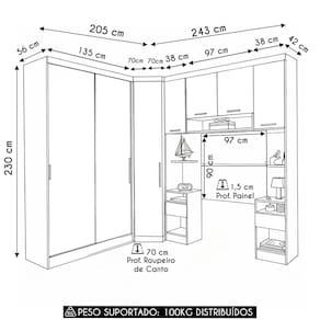 Peso Suportado Distribuído: Guarda Roupa 30Kg/Canto Oblíquo 25Kg/Mesa Cabeceira 15Kg cada/Armário Aéreo 15Kg.