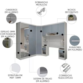 Características do Produto Material da Estrutura: MDP 15mm. Peso Suportado Distribuído: Guarda Roupa 30Kg/Canto Oblíquo 25Kg/Mesa Cabeceira 15Kg cada/Armário Aéreo 15Kg. Acabamento: Finish Foil (FF). Escala de Brilho: Fosco. Possui Prateleira: Sim. Quantidade de Prateleiras: 12 Prateleiras. Possui Maleiro: Sim. Possui Nicho: Sim. Quantidade de Nichos: 5 Nichos. Possui Porta: Sim. Quantidade de Portas: 7 Portas. Tipo de Porta: Convencional/Deslizante. Material das Dobradiças: Metal. Possui Espelho: Sim. Possui Gaveta: Sim. Quantidade de Gavetas: 5 Gavetas. Tipo das Corrediças: Telescópicas. Possui Puxador: Sim. Material dos Puxadores: Polímero/Alumínio. Possui Cabideiro: Sim. Quantidade de Cabideiros: 2 Cabideiros. Possui Pés: Não. Diferenciais: - Design moderno. - Amplo espaço interno. - Cabideiro em alumínio. - Corrediças telescópicas. - Módulos com rodapé. - Porta com espelho. Sistema de Montagem: Cavilhas/Parafusos/Minifix. Manual de Montagem: Sim. Complexidade da Montagem: Alta. Volumes: 15 Volumes. Conteúdo da Embalagem: 1 Guarda Roupa, 1 Canto Oblíquo, 2 Mesas Cabeceira Alta, 1 Armário Aéreo, 2 Painéis Cabeceira. Garantia do Fabricante: 90 dias contra defeito de fabricação. Montagem: Recomendamos que seja feita por um profissional. Recomendação de Limpeza: Utilize pano úmido.