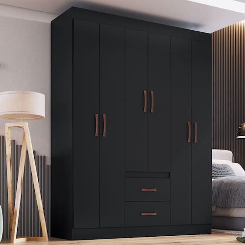 O(a) Guarda-Roupa Solteiro Montevidéu 6 Portas 2 Gavetas Preto - Doripel Móveis é produzido em MDP na escala de brilho Semi-Brilho, e possui um grau de dificuldade de montagem: Médio.