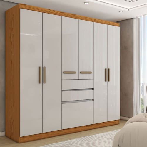 O(a) Guarda-Roupa Solteiro Naturalle 6 Portas 3 Gavetas Freijó/Off White Laca - Loja é produzido em MDP na escala de brilho Brilho e Fosco, e possui um grau de dificuldade de montagem: Médio.