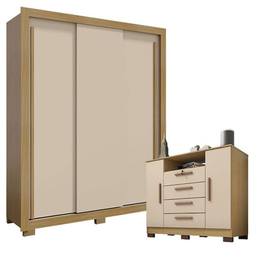 Procurando móveis para o quarto? Apresentamos esse lindo conjunto composto pelo guarda roupa da linha Nevoá e cômoda da linha Madri. Com um design moderno e fabricados com materiais de altíssima qualidade em MDP garantindo maior resistência e durabilidade para os móveis. O guarda roupas posssui amplo espaço interno para organizar roupas e acessórios. Os cabideiros facilitam a organização das peças penduradas, enquanto os 6 pés garantem estabilidade e facilitam a limpeza do ambiente. A cômoda possui 2 portas e 4 gavetas sendo a primeira com chave. Não perca mais tempo a hora é agora venha já garantir o seu!