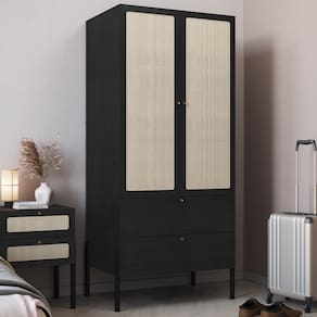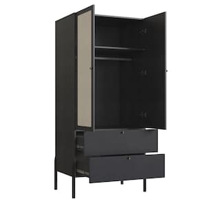 Guarda Roupa Solteiro 28025 combina design escandinavo com praticidade para o dia a dia. Estrutura em MDP 15/25 mm com acabamento em pintura BP. Possui portas com dobradiças metálicas, gavetas com corrediças telescópicas, prateleira inteira, cabideiro superior em alumínio, puxadores dourados em poliestireno e pés em madeira maciça eucalipto com acabamento PU. Destaque para o detalhe em aplique de tela sintética (PVC com poliéster) nas portas e sistema anti-tombamento para maior segurança. Produto entregue em 2 volumes.