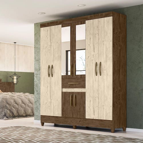 Características Estrutura em MDP de 12mm. Pintura em acabamento UV. 08 Portas articuladas com dobradiças metálicas. Espelhos nas portas centrais. 01 Gaveta central com corrediças metálicas. Cabideiros em alumínio. Amplo espaço interno com prateleiras. Puxadores na cor bronze. Pés em PVC.