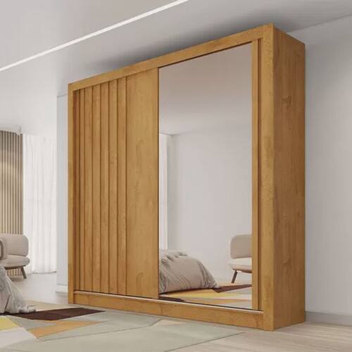 Particularidades do guarda-roupa: Características: - Ripado em MDF; - 100% MDF, chapas de 15mm; - Roldana com regulagem; - Espelho lateral; - Gavetas com corrediças telescópicas; - Cabideiros em alumínio; - Modulado para roupas longas; - Dobradiças modernas e reforçadas;