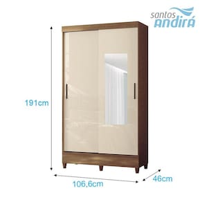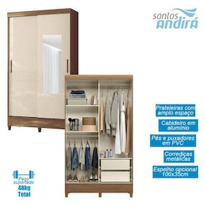 Guarda Roupa Solteiro 2 portas de correr com espelho e pés Fit Jequitibá Off White - Santos Andirá
