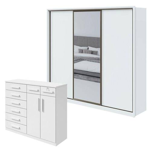 Guarda Roupa Spazio 270 com Espelho e Cômoda Toronto Branco Brilho - Lopas