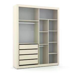 ESPECIFICAÇÕES: Estrutura 100% MDF Pintura UV 2 Portas de Correr com puxadores usinados 4 Gavetas internas Corrediças telescópicas Cabideiros em alumínio Dobradiças metálicas Portas com detalhes em baixo relevo Amplo espaço interno