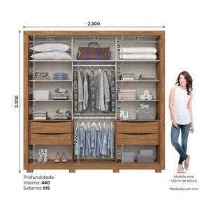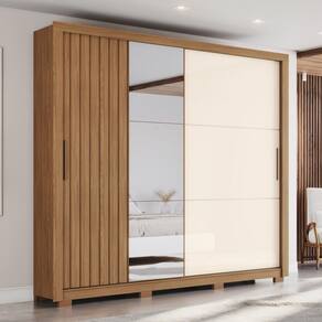 O Roupeiro Vasti combina elegância e praticidade em um único móvel. Possui 02 portas deslizantes com trilho em alumínio, porta com ripados soft, 04 gavetas com corrediças telescópicas e com usinagem para pega, porta com 03 espelhos, cabideiro e calceiro em alumínio, e puxadores em ABS com acabamento bronze. As ripas laterais, frentes e tampos das gavetas na cor da caixa, além de pés em ABS inclusos. Seu amplo espaço interno proporciona uma organização eficiente e funcional para o seu quarto. Cor: Nature/Off White Altura (cm): 230 Largura (cm): 229 Profundidade (cm): 51,5 Cor Interna: Trama Branco (Branco Acinzentado) Escala de Brilho: Fosco Ambiente: Quarto Acabamento: Pintura UV Texturizada Possui Vidros: Não Material Principal: MDP Produto Suporta até (Kg): 90 Kg Possui Espelho: Sim Possui Gavetas: Sim - Quantidade: 4 Und. - Peso Maximo Suportado por Gaveta: 3 Kg Possui Pés: Sim Quantidade de Pés: 8 Und. - Material dos Pés: ABS Possui Portas: Sim - Quantidade: 2 Und. - Tipo: Correr Possui Prateleiras: Sim - Peso Maximo por Prateleira: 8 Kg - Quantidade: 5 Und. Recomendações de Uso, Manutenção e Limpeza: Para limpeza de seu móvel, use uma flanela limpa e seca. Não utilize produtos químicos que possam danificar o produto. Sistema de Montagem: Parafusos e Cavilhas Necessita Montagem: Sim Complexidade da Montagem: Alta: Deve ser montado por um montador especializado. Itens Inclusos: 1 Guarda Roupa e Instrução de Montagem Garantia: 90 Dias