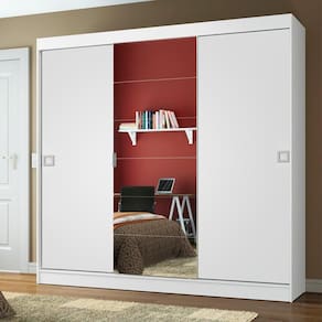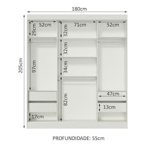 - Itens Inclusos: 3 Cabideiros; 4 Gavetas Internas; 5 Prateleiras; 3 Portas de Correr (1 de Espelho e 2 de Madeira) com Sistema Anti-Descarrilhamento
