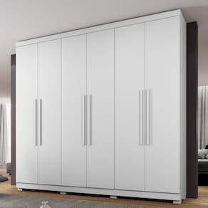 Guarda Roupa Viena 6 Portas 4 Gavetas 10 Prateleiras Branco O Guarda-Roupa Viena 6 portas e produzido em chapa de 15 mm que garante a vida util muito maior. Contem 6 portas e 10 prateleiras e nichos que acomodam suas roupas com maior conforto. Contem 4 gavetas espacosas com corredicas telescopicas que garante suavidade e durabilidade. cabideiro em aluminio, puxadores madeirados e pes inclusos. Sua fabricacao utiliza a linha mdp perffect, que une a sustentabilidade a inovacao tecnologica, proporcionando durabilidade e facil limpeza; inspirando sofisticacao ao mobiliario. Sua pintura UV conta com boa resistencia, e facil de limpar e e ecologicamente correto, pois utiliza madeira de reflorestamento, evitando o desmatamento. Caracteristicas: Material principal: MDP Espessura da chapa: 15 mm Escala de brilho: semibrilho Acabamento: Pintura UV Sistema de montagem: parafuso, cavilha e cantoneiras metalicas Quantidade de Portas: 06 Quantidade de Gavetas: 04 Quantidade de Prateleiras: 10