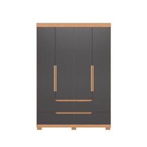 Feito em MDP.Possui detalhes nas portas laterais com acabamento ripado, 4 gavetas com corrediça telescópicas, 4 portas, 2 cabideiros e 10 prateleiras