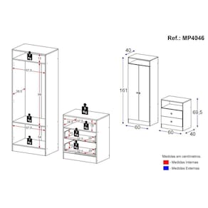 Dimensões do produto montado: Guarda-Roupas - Altura: 161cm | Largura: 60cm | Profundidade: 40cm Cômoda - Altura: 69,5cm | Largura: 60cm | Profundidade: 40cm *Você pode consultar as medidas internas na imagem técnica do produto.