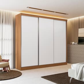 Deixe seu quarto ainda mais lindo, moderno e organizado com a linha de Guarda-Roupas 100% MDF R584 da Loja Oficial Kappesberg. Com o tamanho ideal para um quarto de casal, são 2,18m de altura, 2,45m de largura e 52cm de profundidade, todo produzido em chapa MDF de 15mm, o que garante mais robustez, durabilidade e um melhor acabamento. Com três portas de correr e quatro gavetas, o grande diferencial deste modelo fica por conta das portas reversíveis, podendo optar entre a cor canela ou branco na hora de montar o seu guarda-roupa. Com pintura de sete camadas, tanto na parte interna quanto na externa, a caixaria é na cor canela e pintura touch, com a textura dos veios da madeira, enquanto a cor azul profundo possui acabamento fosco, garantindo uma combinação linda e estilosa, trazendo a sensação de conforto e aconchego ao espaço, além de um design único. E para quem gosta de muito espaço, esse é o modelo perfeito. Com divisões internas iguais dos dois lados, ele possui nichos de tamanhos diferentes, ideais para guardar calçados e roupas dobradas nas prateleiras. Os cabideiros, metálicos e com suporte interno, são perfeitos para peças maiores, como casacos e vestidos. E nas gavetas, com corrediças telescópicas, você organiza acessórios e peças menores com facilidade, deixando seu ambiente sempre organizado. Nas portas, o destaque fica para o puxador em alumínio e o perfil metálico anti-empeno, garantindo mais durabilidade e resistência, sendo a opção perfeita para renovar seu quarto com a qualidade, modernidade e beleza dos Móveis Kappesberg.