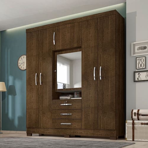 01 x Manual de montagem Acabamento da Prateleira: Pintura UV Escala de Brilho da Prateleira: Fosco Possui Cabideiros: 01 Acabamento da Gaveta: Pintura UV Escala de Brilho da Gaveta: Fosco Material do Puxador da Gaveta: Plástico Possui Organizador de Gaveta: Não Acabamento da Porta: Pintura UV Escala de Brilho da Porta: Fosco Material do Puxador da Porta: Plástico Altura do Espelho: 60 cm Altura dos Pés: 5 cm Ambiente Principal: Quarto Complexidade da Montagem: Média: pode ser montado por mais de uma pessoa e/ou necessite de maior conhecimento para montagem Cor: Malbec Cor do Produto: Malbec Cor Flex: Não Cor Interna: Malbec Escala de Brilho: Fosco Espessura do Espelho: 3 mm Fita Integrada: Sim Formato do Espelho: Quadrado Gaveta com Chave: Sim Guarda-Roupa Suporta Até (kg): 40 kg Itens Inclusos: Manual de Montagem, e uma caixa separada contendo todos os assessórios Parafusos, Pregos, Cavilhas, Kit Ferragens. Largura do Espelho: 47 cm Linha ou Coleção: Incorplac Manual de Montagem e Instalação: https://cdn2.madeiramadeira.com.br/atributo/incorplac/1910234-esquema-de-montagem-roupeiro-6p-3g-gales-com-espelho.pdf Material da Gaveta: MDP Material da Porta: MDP Material da Prateleira: MDP Material dos Pés: Plástico Material Principal: MDP modular: Não Montagem Flex: Não Necessita Montagem: Sim Origem do Produto: Nacional Peso: 106,7 kg Peso Máximo por Gaveta: 5 kg Peso Máximo por Prateleira: 5 kg Possui Calceiros: Não Possui Espaço para Vestidos Longos: Sim Possui Espelho: Sim Possui Espelho Interno: Não Possui Ganchos: Não Possui iluminação: Não Possui Nichos: Sim Possui Painel de TV: Não Possui Pés: 05 Possui Portas: Sim Possui Prateleiras: Sim Possui Sapateira: Sim Quantidade de Espelho: 01 Quantidade de Gavetas: 03 Gavetas Quantidade de Prateleiras: 07 Prateleiras Recomendações de Uso, Manutenção e Limpeza: Limpar com Pano Seco, não utilizar produtos Químicos ou abrasivos Sapatas Niveladoras: Não Sistema de Montagem: Cavilha, girofix, parafusos e cola Suporta Até (kg): 40 kg Tipo de Corrediça da Gaveta: Metálica Telescópica Tipo de Dobradiça/Corrediça da Porta: Metálica Tipo de Fixação do Espelho: Fita Dupla Face Tipo de Gaveta: Externa Tipo de Guarda-Roupa: Casal Tipo de Puxador da Gaveta: Externo Tipo de Puxador da Porta: Externo