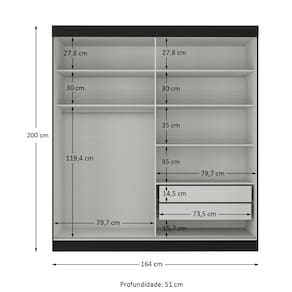 MEDIDAS: [ A ] = 200 cm [ L ] = 164 cm [ P ] = 51 cm PESO: 93,70 kg PESO SUPORTADO: 112 kg GAVETAS SUPORTAM ATÉ: 3 kg PRATELEIRAS SUPORTAM ATÉ: 6 kg CABIDEIROS SUPORTAM ATÉ: 12 kg MODELO: Guarda Roupas Casal 2 Portas de Correr 2 Gavetas Ruby MARCA: Maxel ACABAMENTO: Texturizado TIPO DE PINTURA: Verniz alto brilho MATERIAL: MDP ESPESSURA DO MATERIAL: 12 mm PORTAS: 2 TIPO DE PORTA: Correr CORREDIÇAS: Telescópicas GAVETAS: 2 PRATELEIRAS: 5 MATERIAL DOS PUXADORES: Plástico CABIDEIROS: 1 MATERIAL DOS CABIDEIROS: Alumínio MATERIAL DA DOBRADIÇA: Metal PÉS: Não possui INSTRUÇÕES E CUIDADOS: Utilizar panos secos, não utilizar produtos abrasivos ou químicos, manter longe do contato com água DIFERENCIAL: Perfis coloridos na montagem da porta, gavetas com corrediças telescópicas. ITENS INCLUSOS: 1 Guarda roupas, 1 manual de instruções e 1 kit parafuso GARANTIA: 3 Meses
