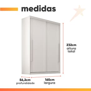 MEDIDAS: A = 232 cm L = 165 cm P = 56,2 cm PRATELEIRAS SUPORTAM ATÉ: 5 kg GAVETAS SUPORTAM ATÉ: 3 kg CABIDEIROS SUPORTAM ATÉ: 5 kg PESO: 156 kg GUARDA ROUPAS SUPORTA ATÉ: 61 kg MODELO: Guarda Roupas Casal 2 Portas de Correr 3 Gavetas Ravena MARCA: Zanzini TIPO DE PINTURA: UV Verniz MATERIAL DA ESTRUTURA: MDF ESPESSURA DO MATERIAL DA ESTRUTURA: 15 mm TIPO DE PORTA: Correr, maior praticidade no dia a dia QUANTIDADE DE PORTAS: 2 QUANTIDADE DE GAVETAS: 3 CORREDIÇAS: Metálicas QUANTIDADE DE PRATELEIRAS: 6 QUANTIDADE DE CABIDEIROS: 2 MATERIAL DO CABIDEIRO: Metal MATERIAL DO PUXADOR: MDF, PARAFUSADO POSSUI SAPATAS PLÁSTICAS: Sim DIFERENCIAL: Guarda Roupa feito 100% em MDF de alta qualidade. ITENS INCLUSOS: 1 Guarda Roupa, 1 Manual de montagem, 1 Kit Parafusos. SISTEMA DE MONTAGEM: Parafusos auto atarraxantes, cola, cavilhas, pregos INSTRUÇÕES E CUIDADOS: Para limpeza de seu móvel, use uma flanela limpa e seca. Não utilize produtos químicos que possam danificar o produto. GARANTIA: 3 Meses