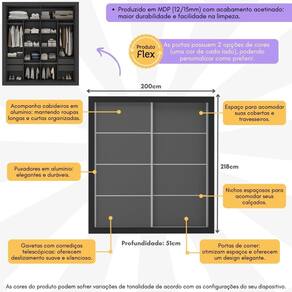 Produzido em MDP (12/15mm) com acabamento acetinado (cerca de 20% de brilho), este guarda-roupas garante resistência e um toque moderno ao ambiente. As 2 portas de correr possuem 2 opções de cores (cada lado de uma cor), permitindo personalizar o móvel entre 3 combinações no momento da montagem, adaptando-o à decoração do seu quarto.