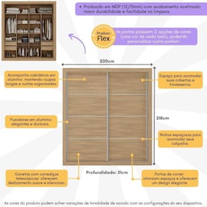 Design e durabilidade: Produzido em MDP (12/15mm) com acabamento acetinado (cerca de 20% de brilho), este guarda-roupas garante resistência e um toque moderno ao ambiente. As 2 portas de correr possuem 2 opções de cores (cada lado de uma cor), permitindo personalizar o móvel entre 3 combinações no momento da montagem, adaptando-o à decoração do seu quarto.