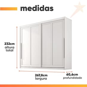 Importante sobre a : A é realizada até a portaria ou porta de entrada do indicado, desde que o acesso seja permitido. Para locais com portaria, a será feita no piso térreo. Não realizamos montagem, desmontagem, por escadas ou içamento. É responsabilidade do cliente verificar se as dimensões do produto são compatíveis com portas, elevadores e corredores. Evite imprevistos: confira todos os detalhes antes de concluir sua compra. MEDIDAS:: A = 232 cm L = 267,8 cm P = 60,6 cm | PRATELEIRAS SUPORTAM ATÉ:: 5 kg | GAVETAS SUPORTAM ATÉ:: 3 kg | CABIDEIROS SUPORTAM ATÉ:: 5 kg | PESO:: 241 kg | GUARDA ROUPAS SUPORTA ATÉ:: 114 kg | MODELO:: Guarda Roupas Casal 2 Portas de Correr 6 Gavetas Firenze | MARCA:: Zanzini | TIPO DE PINTURA:: Fosco | MATERIAL DA ESTRUTURA:: MDF | ESPESSURA DO MATERIAL DA ESTRUTURA:: 15mm | TIPO DE PORTA:: Correr, maior praticidade no dia a dia | QUANTIDADE DE PORTAS:: 2 | QUANTIDADE DE GAVETAS:: 6 | CORREDIÇAS:: Telescópicas | QUANTIDADE DE PRATELEIRAS:: 15 | QUANTIDADE DE CABIDEIROS:: 3 | MATERIAL DO CABIDEIRO:: Metal | MATERIAL DO PUXADOR:: MDF, PARAFUSADO | POSSUI SAPATAS PLÁSTICAS:: Sim | DIFERENCIAL:: Guarda Roupa feito 100% em MDF de alta qualidade, corrediças Telescópicas | ITENS INCLUSOS:: 1 Guarda Roupa, 1 Manual de montagem, 1 Kit Parafusos. | SISTEMA DE MONTAGEM:: Parafusos auto atarraxantes, cola, cavilhas, pregos | INSTRUÇÕES E CUIDADOS:: Para limpeza de seu móvel, use uma flanela limpa e seca. Não utilize produtos químicos que possam danificar o produto. | GARANTIA:: 3 Meses | AVISO:: Importante sobre a : A é realizada até a portaria ou porta de entrada do indicado, desde que o acesso seja permitido. Para locais com portaria, a será feita no piso térreo. | Altura: 232 | Inclui manual de montagem: Sim | Largura: 267,8 | Profundidade: 60,6 | Requer montagem: Sim | Cor: Branco