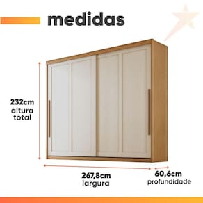 Importante sobre a : A é realizada até a portaria ou porta de entrada do indicado, desde que o acesso seja permitido. Para locais com portaria, a será feita no piso térreo. Não realizamos montagem, desmontagem, por escadas ou içamento. É responsabilidade do cliente verificar se as dimensões do produto são compatíveis com portas, elevadores e corredores. Evite imprevistos: confira todos os detalhes antes de concluir sua compra. MEDIDAS:: A = 232 cm L = 267,8 cm P = 60,6 cm | PRATELEIRAS SUPORTAM ATÉ:: 5 kg | GAVETAS SUPORTAM ATÉ:: 3 kg | CABIDEIROS SUPORTAM ATÉ:: 5 kg | PESO:: 241 kg | GUARDA ROUPAS SUPORTA ATÉ:: 114 kg | MODELO:: Guarda Roupas Casal 2 Portas de Correr 6 Gavetas Firenze | MARCA:: Zanzini | TIPO DE PINTURA:: Fosco | MATERIAL DA ESTRUTURA:: MDF | ESPESSURA DO MATERIAL DA ESTRUTURA:: 15 mm | TIPO DE PORTA:: Correr, maior praticidade no dia a dia | QUANTIDADE DE PORTAS:: 2 | QUANTIDADE DE GAVETAS:: 6 | CORREDIÇAS:: Telescópicas | QUANTIDADE DE PRATELEIRAS:: 15 | QUANTIDADE DE CABIDEIROS:: 3 | MATERIAL DO CABIDEIRO:: Metal | MATERIAL DO PUXADOR:: MDF, PARAFUSADO | POSSUI SAPATAS PLÁSTICAS:: Sim | DIFERENCIAL:: Guarda Roupa feito 100% em MDF de alta qualidade, corrediças Telescópicas | ITENS INCLUSOS:: 1 Guarda Roupa, 1 Manual de montagem, 1 Kit Parafusos. | SISTEMA DE MONTAGEM:: Parafusos auto atarraxantes, cola, cavilhas, pregos | INSTRUÇÕES E CUIDADOS:: Para limpeza de seu móvel, use uma flanela limpa e seca. Não utilize produtos químicos que possam danificar o produto. | GARANTIA:: 3 Meses | AVISO:: Importante sobre a : A é realizada até a portaria ou porta de entrada do indicado, desde que o acesso seja permitido. Para locais com portaria, a será feita no piso térreo. | Altura: 232 | Inclui manual de montagem: Sim | Largura: 267,8 | Profundidade: 60,6 | Requer montagem: Sim | Cor: Madeirado / Areia