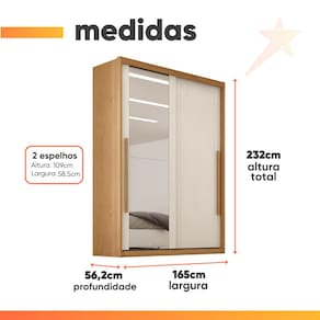 MEDIDAS: A = 232 cm L = 165 cm P = 56,2 cm MEDIDAS DO ESPELHO (cada): A = 109 cm L = 58,5 cm PRATELEIRAS SUPORTAM ATÉ: 5 kg GAVETAS SUPORTAM ATÉ: 3 kg CABIDEIROS SUPORTAM ATÉ: 5 kg PESO: 156 kg GUARDA ROUPAS SUPORTA ATÉ: 61 kg MODELO: Guarda Roupas Casal 2 Portas de Correr com Espelho 3 Gavetas Ravena MARCA: Zanzini TIPO DE PINTURA: UV Verniz MATERIAL DA ESTRUTURA: MDF ESPESSURA DO MATERIAL DA ESTRUTURA: 15 mm TIPO DE PORTA: Correr, maior praticidade no dia a dia POSSUI ESPELHO: Sim, 2 QUANTIDADE DE PORTAS: 2 QUANTIDADE DE GAVETAS: 3 CORREDIÇAS: Metálicas QUANTIDADE DE PRATELEIRAS: 6 QUANTIDADE DE CABIDEIROS: 2 MATERIAL DO CABIDEIRO: Metal MATERIAL DO PUXADOR: MDF, PARAFUSADO POSSUI SAPATAS PLÁSTICAS: Sim DIFERENCIAL: Guarda Roupa feito 100% em MDF de alta qualidade e portas de correr com espelho. ITENS INCLUSOS: 1 Guarda Roupa, 1 Manual de montagem, 1 Kit Parafusos. SISTEMA DE MONTAGEM: Parafusos auto atarraxantes, cola, cavilhas, pregos INSTRUÇÕES E CUIDADOS: Para limpeza de seu móvel, use uma flanela limpa e seca. Não utilize produtos químicos que possam danificar o produto. GARANTIA: 3 Meses