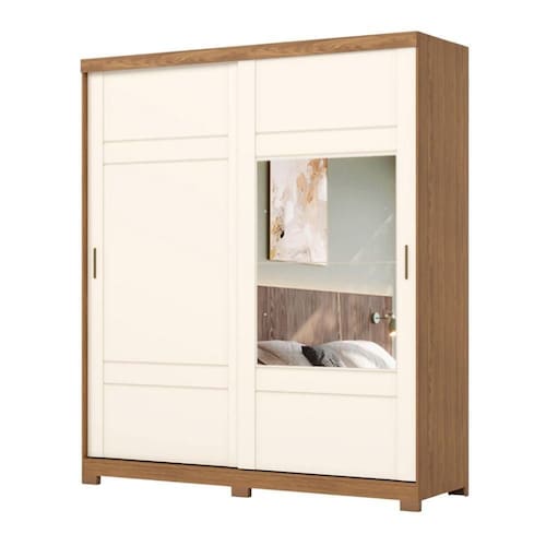 Portas de Correr com Espelho: Otimizam o espaço do quarto, eliminando a necessidade de área para abertura das portas, e o espelho integrado amplia o ambiente, além de ser muito útil no dia a dia.