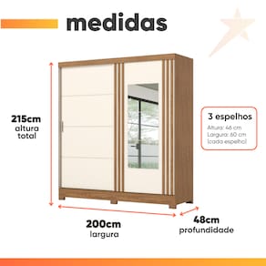 MEDIDAS: A = 215 cm L = 200 cm P = 48 cm MEDIDAS DO ESPELHO (Cada lâmina): A = 46 cm L = 60 cm MEDIDAS DOS PÉS: A = 5 cm L = 10 cm P = 4 cm PRATELEIRAS SUPORTAM ATÉ: 8 kg GAVETAS SUPORTAM ATÉ: 3 kg CABIDEIROS SUPORTAM ATÉ: 8 kg PESO: 112,57 kg GUARDA ROUPAS SUPORTA ATÉ: 85 kg MODELO: Guarda Roupas Casal 2 Portas de Correr com Espelho Ripado 3 Gavetas Jasmim MARCA: Henn MATERIAL: MDP ESPESSURA DO MATERIAL DA ESTRUTURA: 12 mm TIPO DE PORTA: Correr, maior praticidade no dia a dia PORTAS: 2 DOBRADIÇAS: Metálicas GAVETAS: 3 CORREDIÇAS: Metálicas PRATELEIRAS: 6 CABIDEIROS: 2 MATERIAL DO CABIDEIRO: Madeira ESPELHO: Sim, 3 lâminas PUXADORES: 2 unidades, em Alumínio PÉS: 6 unidades DIFERENCIAL: Portas de correr com espelho ITENS INCLUSOS: 1 Guarda Roupa, 1 Manual de montagem, 1 Kit Parafusos. SISTEMA DE MONTAGEM: Parafusos e Cavilhas INSTRUÇÕES E CUIDADOS: Para limpeza de seu móvel, use uma flanela limpa e seca. Não utilize produtos químicos que possam danificar o produto. GARANTIA: 3 Meses